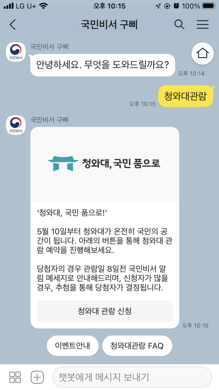 카카오톡은 좀 더 쉽고 빠르게 모바일 핸드폰에서 청와대 관람 신청 예약을 진행 하실 수 있네요~