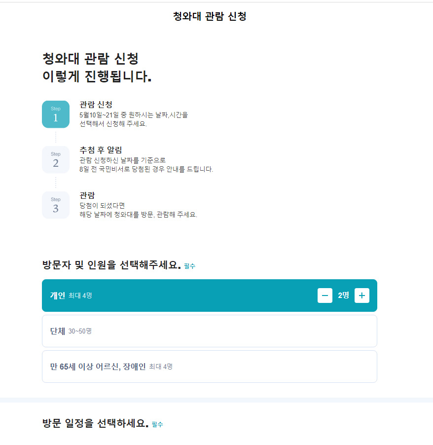 위와 같이 네이버나 카카오톡 처럼 관람을 원하시는 기간, 관람을 원하시는 인원 등을 간편하게 입력 하시고 신청하기 버튼을 클릭, 터치 하시면 끝!