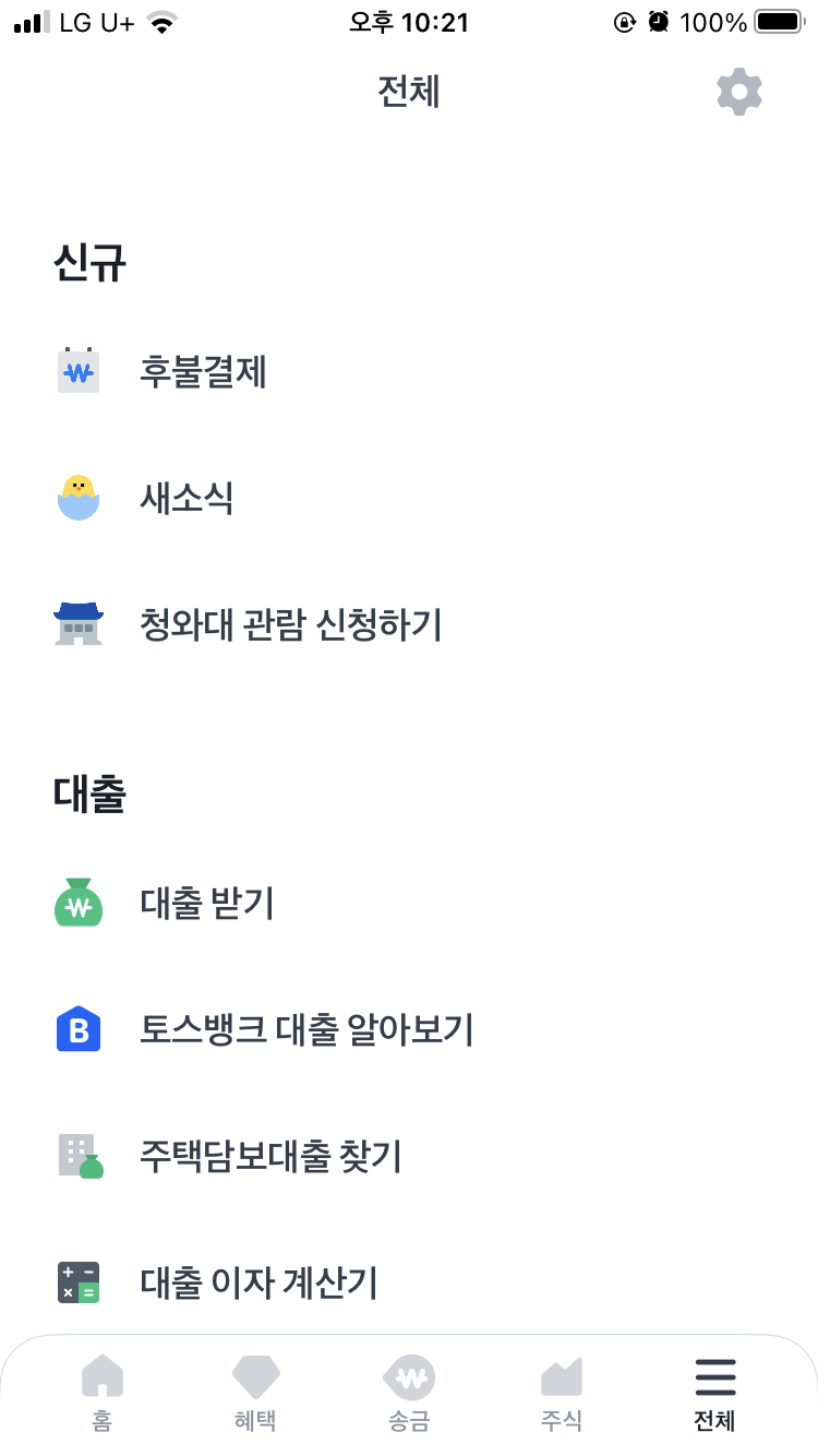 토스 앱 전체 메뉴 보기 에서 신규 카테고리 새소식 바로 아래에 [청와대 관람 신청하기] 가 똭! 잘~ 보이네요~~