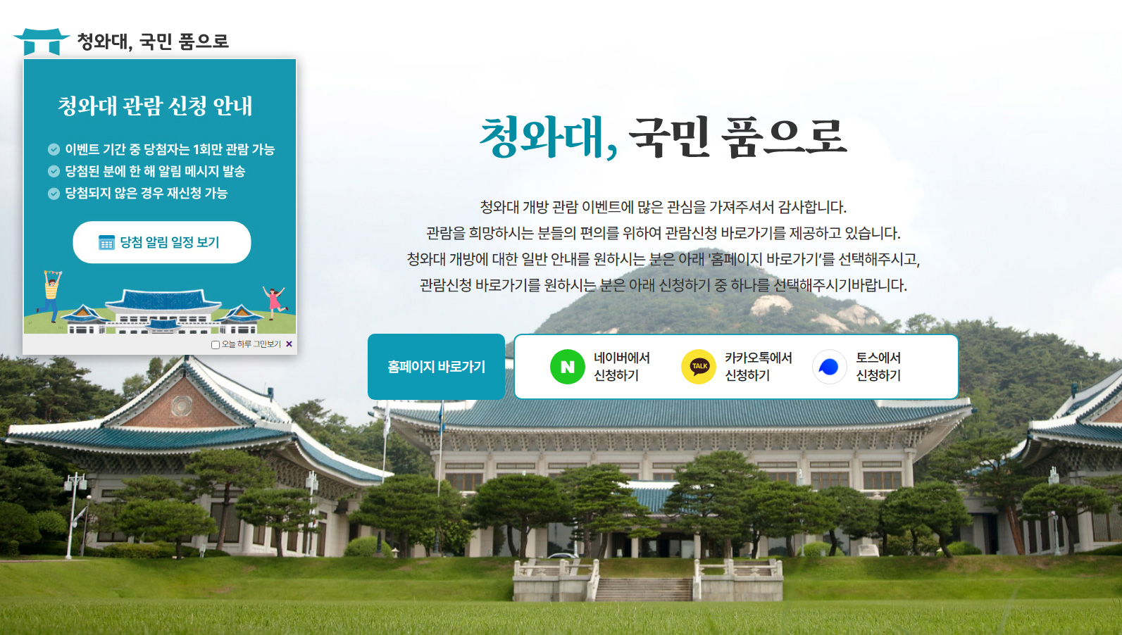 천천히 알아보시고, 나서 여유있게 예약을 진행하신다면... 기본 [홈페이지 바로가기] 를 통해서 청와대 개방 오픈 관람관련 메인 홈페이지를 이용하시는 것을 추천 드립니다!